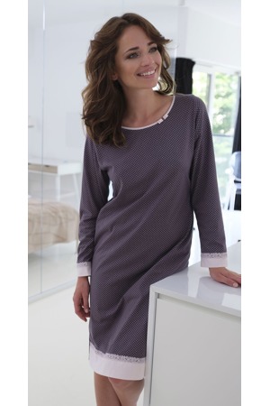 Efektní dámská noční košile, která je vyrobená z velmi kvalitní puntíkované bavlny. Půlkulatý výstřih je ozdobený mašličkou. Spodní okraj košile a manžety jsou obšité jemnou krajkou. Složení: 100 % bavlna.