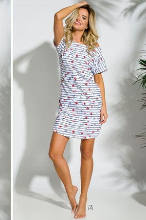 Pohodlná a komfortní noční košile s krátkými rukávy.Košile má velký lodičkový výstřih. Přední díl tohoto modelu je ozdobený potiskem. Spodní část košile je půlkulatá. Délka modelu je nad kolena.Složení: 100 % bavlna.