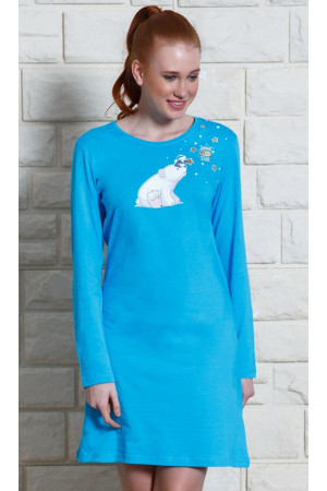 Dámská bavlněná noční košile s dlouhým rukávem Méďa na saních. Noční košili zdobí potisk ledního medvídka. Bavlněný materiál je poddajný a jemný na dotek. Noční košile je vhodná i na denní nošení.Materiály použité u tohoto výrobku jsou certifikovány, dosáhly nejvyšší možné kvality. Pokyny pro údržbu: - 100% bavlna- lze prát v pračce při teplotě do 30°- nesušit v sušičce- žehlit z rubu do 110°- nepoužívat bělící prostředky- nečistit chemicky S výběrem správné velikosti by Vám měla pomoci tato tabulka: Dámská košile Velikost S M L XL 2XL Obvod hrudníku 92 96 100 104 108 Délka košile 92 93 94 95 96