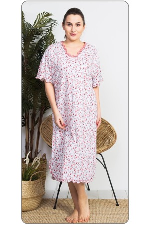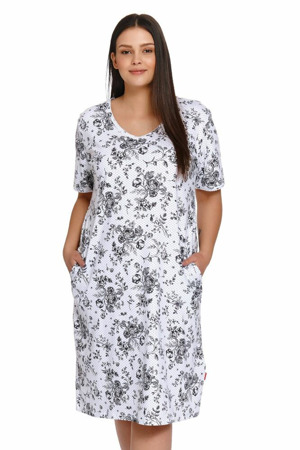Dámská noční košile s krátkým rukávem Jasmína. Polodlouhá noční košile je ve výstřihu olemována žebrováním,stejně jsou zakončeny i rukávy a spodní lem košile. Látka košile je potištěna drobnými kvítky.Košile má délku po lýtka. Použitý materiál je jemný a poddajný na dotek. Košile je vhodná i na denní nošení...