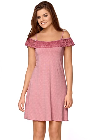 Dámská noční košilka, která je vyrobená z jemné viskózy s drobnými puntíky. Model má efektní výstřih s odhalenými rameny. Výstřih je ozobený krajkou s květinovým motivem. Délku úzkých ramínek je možné nastavit. Složení: 94 % viskóza, 6 % elastan.