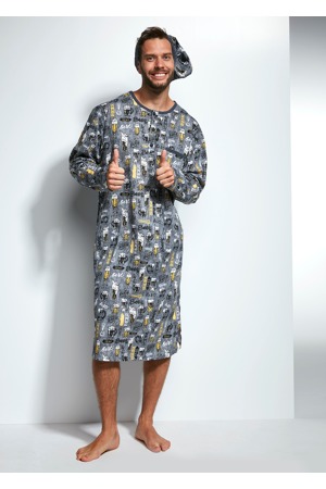Pánská noční košile, která je vyrobená z velmi kvalitní vzorované bavlny. Košile má dlouhé rukávy. Půlkulatý výstřih se zapíná třemi knoflíčky. Komplet doplňuje čepice na spaní. Vzor košile zachycuje fotografie č. 2. Složení: 100 % bavlna.