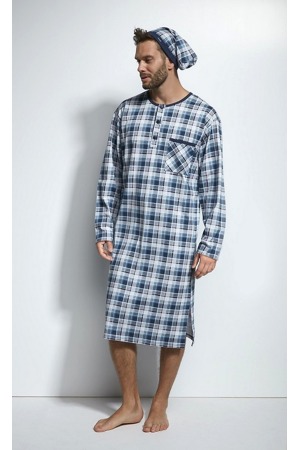 Pánská noční košile, která je vyrobená z velmi kvalitní károvné bavlny. Půlkulatý výstřih se zapíná třemi knoflíčky. Komplet doplňuje čepice na spaní. Vzor modelu zachycuje druhá fotografie. Složení: 100 % bavlna.