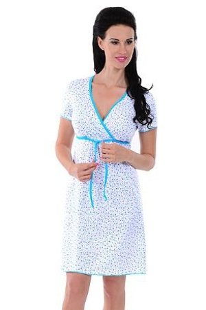 Krásná, pohodlná košilka, ušitá z měkké viskozy. Díky plisování pod prsy dobře padne na bříško. Košíčky a oblast pod prsy jsou z bílé krajky, která v kombinaci s květovanou viskozou dává modelu mladistvý vzhled. Pod prsy je gumka, která podrží rostoucí poprsí. Košilka je vhodná jak pro těhotné tak pro kojící ženy. 70% viskoza, 20% elastan, 10% bavlna.
