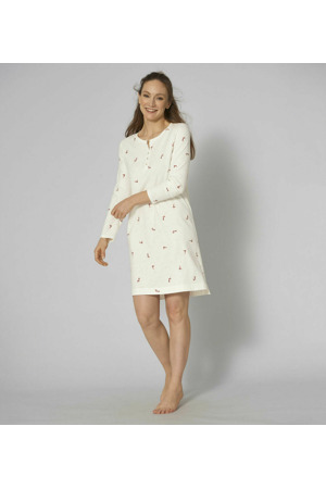 Dámská noční košile, která je vyrobená z velmi kvalitní vzorované bavlny. Košile má 3/4 rukávy. Jednobarevné manžety jsou ozdobené krajkou v kontrastní barvě. Půlkulatý výstřih je ozdobený saténovou mašličkou. Model má délku nad kolena...