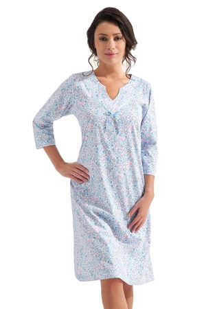 Dámská bavlněná noční košilka Luna 167 s krátkými rukávy. Košilka v bílé barvě je po celé ploše pokrytá modrým a různobarevným vzorem květů a teček. Lem kolem krku a rukávů je v modré barvě. Rukávy a výstřih mají zdobení malými bílými mašličkami. Košilka je vyrobena z velmi kvalitního a příjemného materiálu. Materiálové složení: 100% bavlna. Velikosti: M až XXL. Baleno v plastovém sáčku.