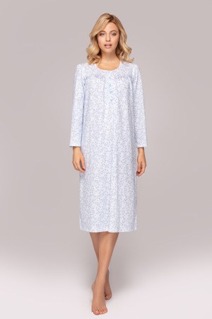 Dámská noční košile s dlouhými rukávy. Košile je vyrobená z hladké bavlny. Model má půlkulatý výstřih se zapínáním na knoflíčky. Výstřih je ozdobený jemnou květinovou výšivkou. Délka košile je pod kolena...