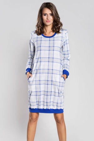 Klasická noční košile. Košile má krátké rukávy, kulatý výstřih a usnadňuje přístup k poprsí. Ve přední části modelu je všitá gumička. Model má pohodlný střih. Košile je vyrobená z bavlněné látky příjemné na dotyk. Přední díl modelu zdobí saténová mašlička. Košile je ozdobená jemným károvaným vzorem. Složení: 100% bavlna.