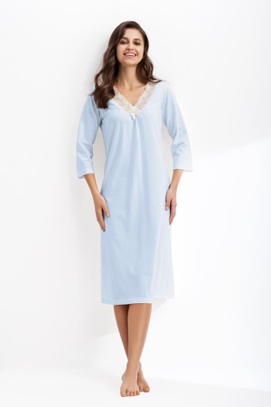Dámská noční košile s krátkými rukávy. Košile je vyrobená z velmi kvalitní bavlny. Výstřih je ozdobený barevnou přízí a zapíná se knoflíčky. Na úrovni poprsí je jemné nařasení. Složení: 100 % bavlna.